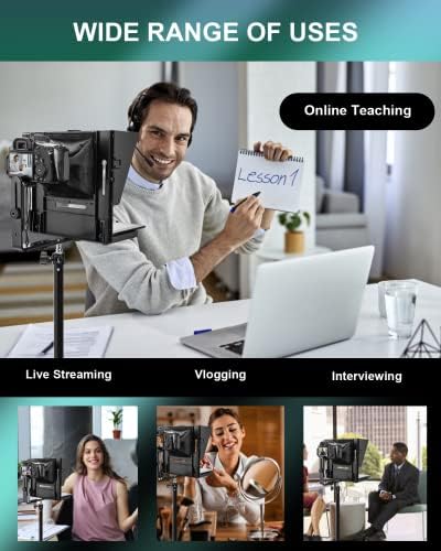【Wide Angle Lens & 3 Cold Shoe Mounts】: This teleprompter supports wide angle lens more than 24mm, producing no vignetting effects on wide vision shooting. Designed with 3 cold shoe mounts to attach video accessories such as ring light and microphone, and 1/4 standard screw on the bottom to attach tripod or light stand, our teleprompter is perfect for video shooting like live streaming on tiktok,vlogging, zoom meeting, interviewing, online teaching, etc.