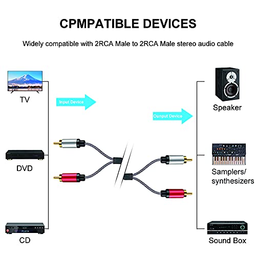 Connecting 2RCA male to 2RCA male. Can be used on home equipment such as DVD/VCD, TV, home theater system and so on; and professional audio equipment such as mixers, amplifiers, stereos, etc.
