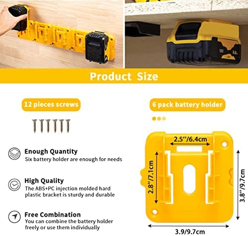 Specifications: Battery mount holder for Dewalt 20V/60V battery. Application: Fit for DCB200 DCB201 DCB202 DCB203 DCB204 DCB205 DCB206 DCB208 DCB205 DCB206 DCB609 Battery Material: ABS Color: Yellow Install:Mount this holder on a wall or under a shelf with the included screws. Package Include: 5pcs holder, 12pcs screws