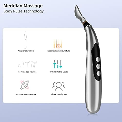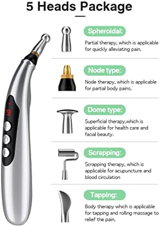 Acupuncture Pen, Meridian Energy Pen, Electronic Acupuncture Machine, Pain Relief Massager, Beauty Face Pen Massager, USB Rechargeable, 5 Different Heads, Silver