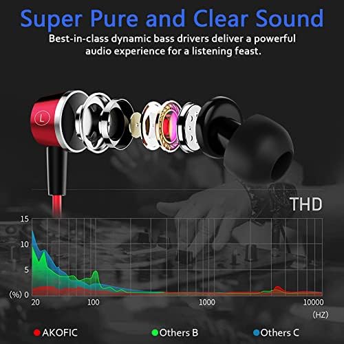 AKOFIC Earphones, In-Ear Headphones Wired Earphones with Microphone, Noise Isolating Wired Earbuds Bass Lightweight 3.5mm Jack Compatible with iPhone, iPad, Smartphone, MP3 Player, Laptop (Red)