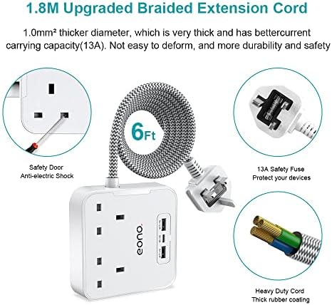 Amazon Brand – Eono Extension Cable Lead with USB C, 3250W 13A, Power Strips with 2 Way Outlets 3 USB Slots Plug Extension Socket with 1.8 Meter Braided Extension cord for Home Office accessories