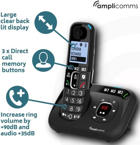 Amplicomms BigTel 1582 Cordless Big Button Phone for Elderly with Answer Machine Plus Additional Handset – Loud Phones for Hard of Hearing – Hearing Aid Compatible Phones – Cordless Number Telephone