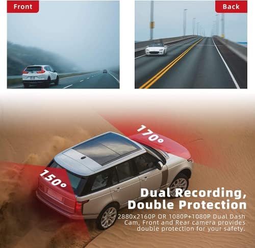 1080P&Double Protection: With the Sony IMX307 sensor, the dash cam captures the road ahead in more details and license plates clearly at 1920x1080P@30fps. Or utilize the front cam only to record the front view at 2880x2160P@24fps to capture license plates.The car camera equipped with dual-lens, front and the rear camera provides double protection for your safety
