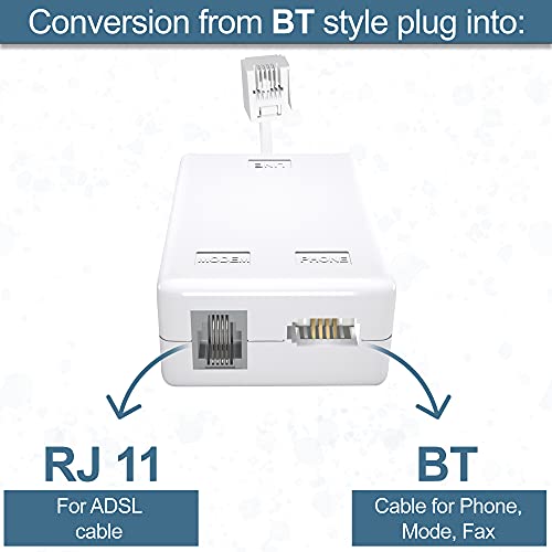 ✅ ENHANCED SIGNAL STABILITY: Our ADSL splitter has a BT plug to RJ11 connector that splits the connection line between the BT line and office equipment such as modem or fax and maintains signal stability to your devices while preventing dropouts and noise. Using this telephone adaptor you can use broadband at the same time.