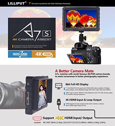 Black Lilliput A7s 7 inch 1920×1200 HD IPS 500cd/m2 Camera Field Monitor 4K HDMI Input output Video DSLR Camera A7 A7R A7S III A6500 GH5 GH5s 5D 70D D810 Ronin S