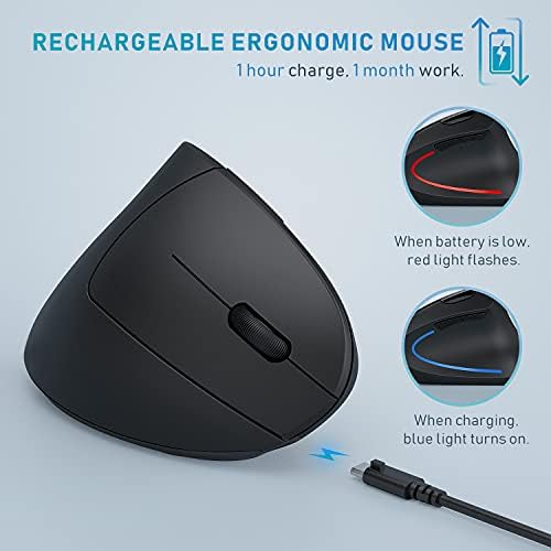 You can use the vertical mouse with the 300mAh lithium battery Charge easily with the USB cable without changing the batteries. When the battery is almost empty, the red power indicator flashes. The power indicator lights up blue during the charging process and goes out when the charging is complete.