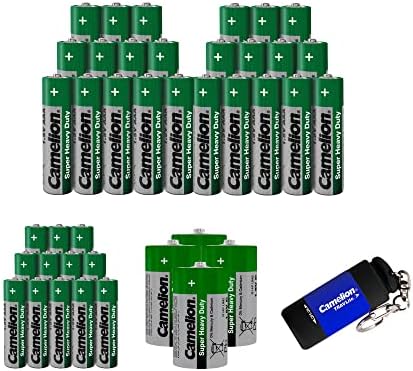 Camelion Super Heavy Duty / zinc-carbon batteries deliver economic power for a wide range of devices such as flashlights, radios and remote controls. A unique design ensures leak protection, a long shelf life and durability. The CAMELION zinc-carbon batteries contain no cadmium and mercury, thus conserving the environment. This set contains 24x AA R6P Batteries, 12x AAA R03P Batteries, 4x C R14P Batteries, Free flashlight keychains