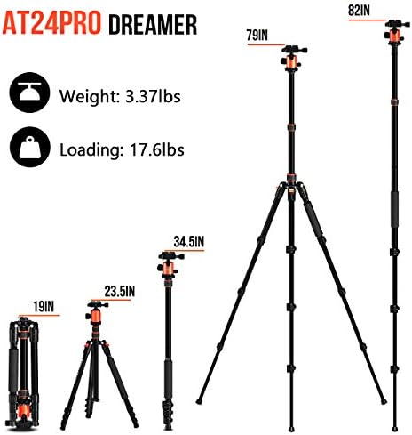 【Adjustable and Extendable】: 4-section columns leg with quick release flip-locks allows you to extend tripod stand to the maximum height of 79 inches or contract to the minimum height of 23.5 inches in seconds; 3-position leg angle adjustment system can provide flexible shooting for different photography scenarios and conditions.