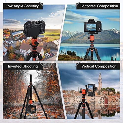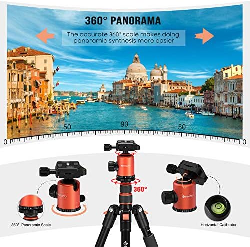 【360° panoramic ball-head and inverted column】: unique design of two independent locks, can rotate the ball head to obtain a 360° panoramic shooting angle, the center column can be flipped and installed, so that you can shoot at low angles; accurate 360° scale You can achieve precise image alignment. The level calibrator helps to adjust the tripod on uneven ground. The tripod can fully meet your shooting needs.