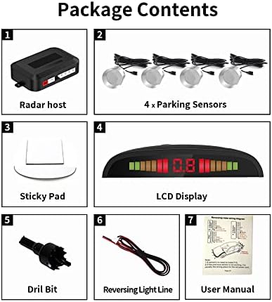 [Multi Color to Select] Multi Color to Select(Black/Red/Grey/White/Fiat Red/Champagne Gold/Blue/Silver). 4 Weather Proof Sensors + LED Distance Display. Package Includes:1 * Main Control Box; 1 * Sound Alert Indicator; 4 * Parking Sensors; 1 * Hole Saw; 1 * Power Cable; 2 * Double Side Sticker; 1 * User Manual