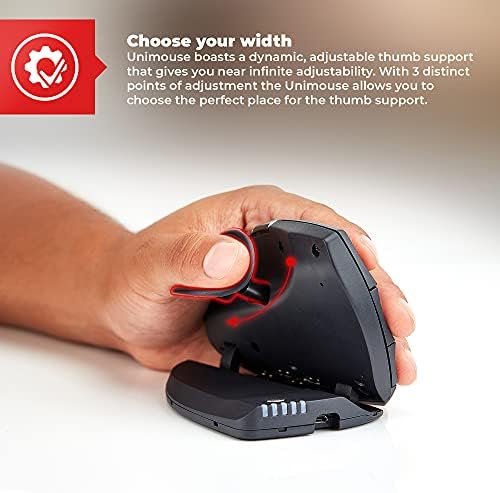 ERGONOMIC: The Unimouse is an ergonomic mouse with a thumb support that can be adjusted in all directions: in/out, up/down, forward/backwards, inclination and rotation. This alleviates gripping pain and pressure on the base of the thumb, thus reducing repetitive strain injuries and allowing you to maintain a relaxed grip on the mouse – whatever the size and shape of your hand.