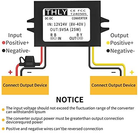 【Buck Converter】This DC buck converter 8-40V to 5V converts the DC 8-40V into DC 5V. Low power consumption. Voltage input: DC 8-40V, output: DC 5V. Max Current: 5A 25W. WARNING: 1.Please confirm whether the output voltage is correct before use; 2.Please confirm the positive and negative polarity of the power before wiring; 3.Must connect the input negative wire to GND or – before use, or the output volts will not change!