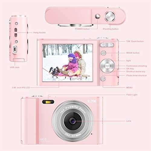 Digital Camera 2.7K HD Compact Camera 44MP 2.88 Inch LCD Rechargeable Students Pocket Camera with 16X Digital Zoom Youtube Vlogging Camera for Teens, Kids, Beginners, Adults(Pink)