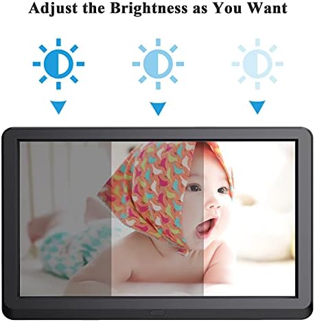 ????️ 【10 Inch HD LCD Screen】 The 10 inch family photo frame with 1920 x 1080 high resolution,16:9 IPS screen and 178 degree wide viewing angle, perfectly displays crisp and vivid photos and videos.You can also adjust the brightness (0-100) of the screen according to the room light.