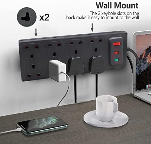 EXTRASTAR Universal Extension Lead, 8 Way Outlets Surge Protection Power Strips with Switch, Wall Mounted 13A/MAX.3120W Fused UK Power Socket (2M, Black)