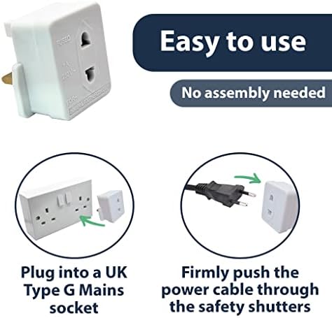 The plug converts a standard UK 3-pin socket to a 2-pin socket for ease of use with your new or existing device. The plug accepts both Type-A and Type-C power cables.