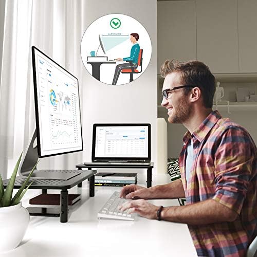 3 Height Adjustments – This monitor stand riser comes with 3 adjustable height levels (9-12-14cm) allowing you to choose the most ergonomic, healthiest and most comfortable viewing angle while working. Simply press the button on the leg and lift the platform to adjust between the different height levels