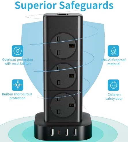 Multiple Safety Protection – The desktop power strip with 12 sockets and 4 USB is certified by CE, BS1363/A, RoHS. Built in overload protection, an integrated circuit breaker will trip off automatically to protect your devices while the power overloads. Short-circuit protection, child safety door and 750°C fire-resistant materials ensure full protection for you and your equipment.