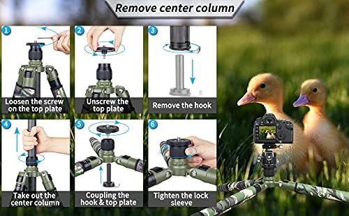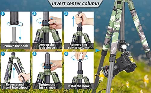 【2 in 1 Tripod Design】One tripod leg tripod can be detached and combined with the center column to form a monopod, disassembly process is simple and quickly. Monopod high up to 76.2in/193.5cm, and the height can adjusted to suitable for use in multiple scenarios .The center column can be inverted and can be used for macro shooting at special angle.