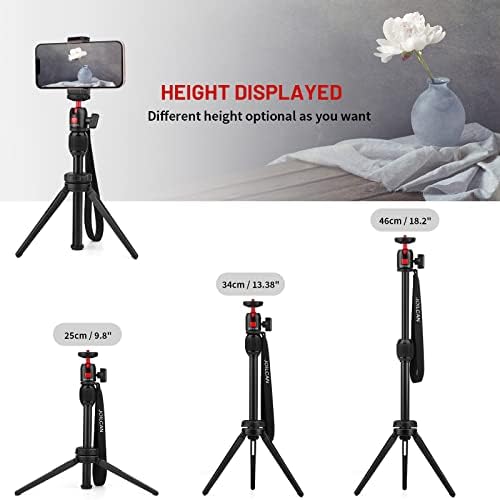 【Height adjustable】The smartphone tripod has 2 levels of height adjustment. Extends height from 9.8″/25cm to 18.2″/46cm when used as a mini tripod and from 9.5″/24cm to 14.2″/36cm when used as a selfie stick. You can freely adjust the height according to different scenes