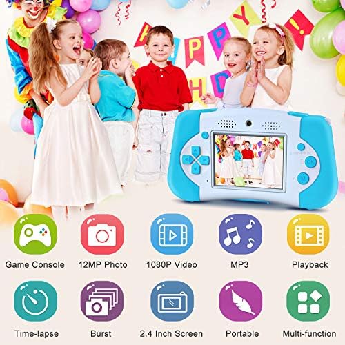 Dual Lens Kids Selfie Camera with MP3: front and rear lens of this kids camera can take 12MP pictures and 1080P HD video. Built-in MP3 function and game console, Supply download music, stories and games to SD card to play.
