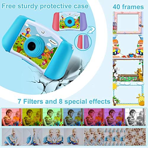 Multifunctional kids camcorder video recorder: This toddler camera supports taking photos and selfie, video shooting, voice recording, playback, music, flashlights. 40 Funny photo frames, 7 filters, and 8 special effects.