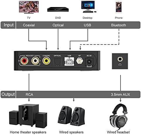 [HiFi Lossless Sound] 1Mii HiFi DAC supports USB/Optical/Coaxial in and 3.5mm AUX/RCA Out, you can connect it with PC, TV or CD player to enjoy HiFi lossless music through speakers, home stereo or headphone.