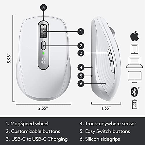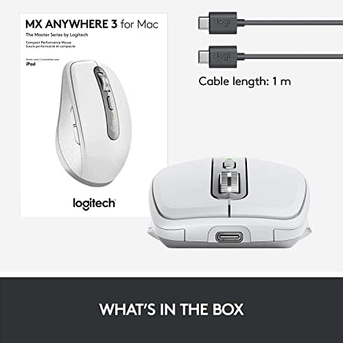 USB-C CHARGING: Top up your mouse with 3 hours of use from a 1-minute quick charge. USB-C charging cable is included. MX Anywhere 3 stays powered for up to 70 days on a full charge