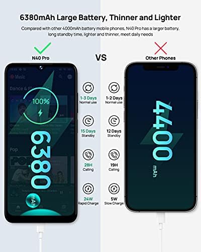 【6380mAh Battery, 24W Type-C Fast Charge】 DOOGEE N40 Pro sim free mobile phone has a big 6380mAh battery to meet the needs of long-term standby (15 days). Bigger battery, but lighter and thinner than other phones, easy to carry (Thickness: 9.9mm, Weight: 210g). 24W Type-C fast charging and OTG reverse charging offer an easy life.