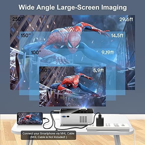 【Enjoy 250” Giant Screen & Phone Screen Sync】You can easily adjust focus and keystone correction by yourself, gain a clear and an ideal horizontal angles images with watching size from 60″ to 250″ (distance from 5.9ft-29.6ft). Using more stable wired screen sync technology, cast movie, videos, games, photos to the 250’’ giant screen anytime ,connect your wirelss enjoy the the home cinema world.