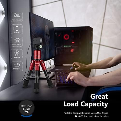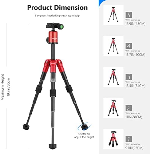 NOTE: Camera not includedDescriptionQuick shoe plate helps ensure fast transitions between shots. The legs are a 5-segment interlocking crutch-type design. The carrying bag brings you great convenience. 360 degree dial of swivel ball head with bubble level provides you with a panoramic view.Three position leg angle adjustment system provides flexible shooting. SpecificationsMaterial:Aluminum alloy Maximum Height:19.7″/50cm Minimum Height:9.1″/23cm Loading Capacity:11lbs/5kg Screw:1/4″ Color: Red Package Contents1 x 19.7″/50cm Aluminum alloy Mini Tripod 1 x Carrying Bag