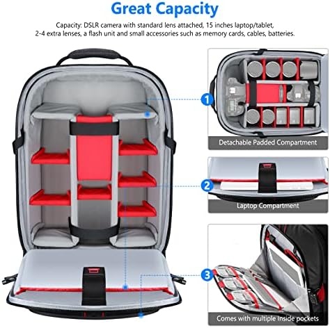 【Large Capacity】 The bag with removable padded dividers can hold a mirrorless camera with 70-200mm lens attached, a second camera body and up to 4 lenses. Customize the interior to organize your lenses, flashes, a 15” laptop or a tablet, and more