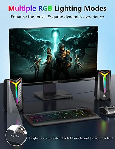 ✅Dynamic RGB Lighting Bar: This PC gaming monitor speakers has 6 lighting modes(4 static light modes + 2 dynamic mode). You just need tap the top light mark of the speaker to switch the RGB lighting mode and choose the desired lighting mode according to your needs.6 RGB lighting effect aim to elevate your gaming experience