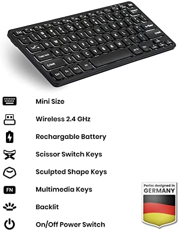 Perixx PERIBOARD-732B Wireless 2.4 GHz Backlit Mini Keyboard, X Type Scissor Keys, White Backlit, UK QWERTY, Black