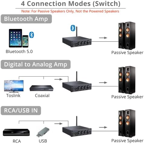 PROZOR Home Stereo Amplifier Bluetooth 5.0 Audio Power Amplifier 100W X 2 Support Optical Coaxial U-disk Input Bass Treble Control Bluetooth Amplifier Receiver with Remote Control for Passive Speaker