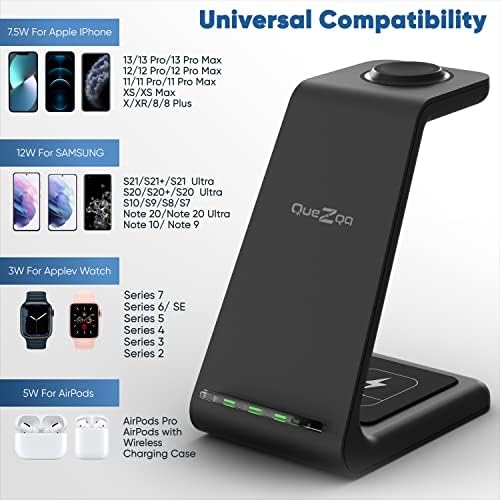 3 in 1 Wireless Charger: The best multi-functional device to charge all your gadgets in one place. QUEZQA 3 in 1 wireless charging station is fully compatible with your Qi-enabled phone, Apple Watch, and AirPods. Perfect wireless charger for Apple Watch series 7/SE/6/5/4/3/2, AirPods Pro/2, iPhone 13/13 Pro/13 Pro Max/12/12 Pro/12 Pro Max/11/11 Pro/11 Pro Max/X/Xs/Xs Max/8/8 Plus Samsung S9 /S8/Note8/ S7 Edge, etc