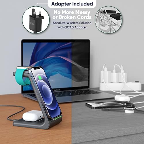 Safe and Powerful: We use high-quality components and multi-protection technologies that provide temperature control, overcurrent and overvoltage protection. Plus, the material used for this wireless charging station is 100% anti-static. Unlike other charging stations, with us you will get a QC3.0 18W UK adapter included in the package which delivers fast charging 10W for Samsung and 7.5W for iPhone!