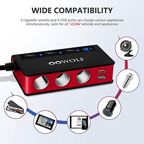 Quick Charge 3.0 Car Adapter, 180W Cigarette Lighter Adapter 12V/24V Cigarette Lighter Splitter 4USB Ports 3-Socket Car Splitter 6.6A LED Voltmeter Car Charger