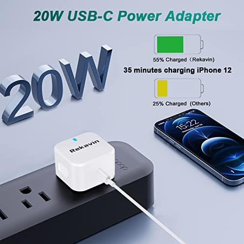 ⚡20W Fast charging Design for iPhone: Rekavin 20W USB-C Power Adapter Plug support with USB C PD Cable provides a much more faster charging speed for your iPhone and ipad, Such iPhone 13 can be charged from 0% to 50% in only 30 minutes, 3 times faster than traditional 5W/1A adapter (Not Included Cable).