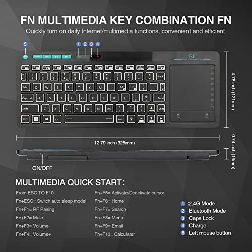 Rii Wireless Keyboard with Touchpad, Rii RT518S Bluetooth Keyboard Dual Mode Backlit Multimedia Keyboard Rechargeable for Android TV Box,PC,Tablets,Smart TV, HTPC, IPTV,Windows