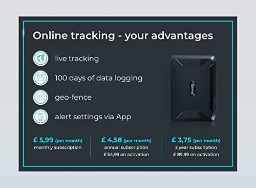 ONLINE TRACKING – Enjoy all advantages of online tracking such as precise, worldwide, live location or 100 days of route information. All alarms and functions can be set very easily via the app. Choose one of our all inclusive subscription options: £3,75 per month (£89,99 every 2 years), £4,58 per month (£54,99 yearly) or £5,99 per month (£5,99 monthly). Further advantages can be found in the description below.