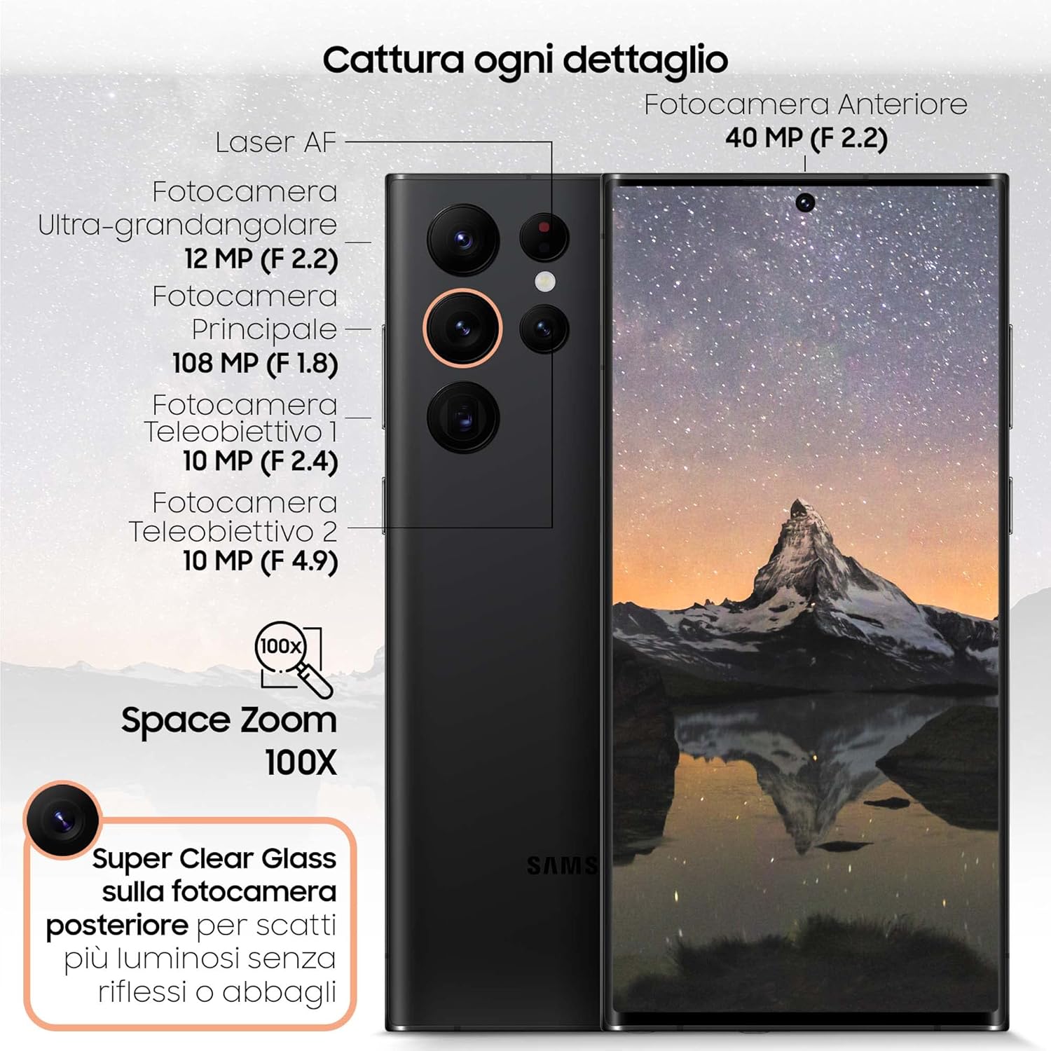 Samsung Galaxy S22 Ultra SM-S908B. Display diagonal: 17.3 cm (6.8″), Display resolution: 3088 x 1440 pixels, Display type: Dynamic AMOLED 2X. Processor frequency: 2.8 GHz, Processor family: Samsung Exynos, Processor model: 2200. RAM capacity: 12 GB, Internal storage capacity: 256 GB. Rear camera resolution (numeric): 108 MP, Rear camera type: Quad camera. SIM card capability: Dual SIM. Operating system installed: Android 12. Battery capacity: 5000 mAh. Product colour: Black. Weight: 228 g Processor