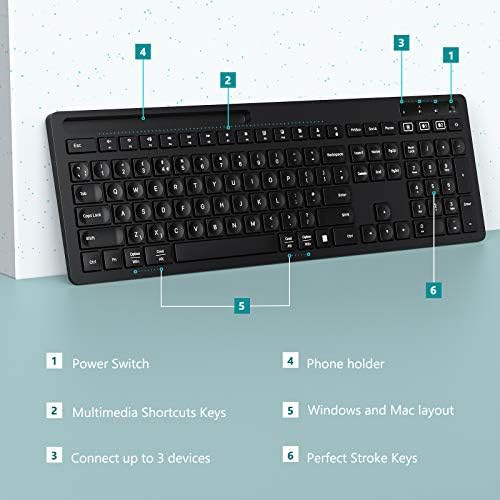 ⌨Energy Saving & Silicone Keyboard Cover — Our multi-device keyboard comes with a silicone keyboard cover so it can provide perfectly protection for the keyboard.Waterproof and Dustproof.There is a independent ON/OFF switch on the right top of the keyboard.Save battery life and reduce battery replacement.♥♥The ergonomic wireless keyboard is powered by 2 AAA batteries(Batteries are not included)