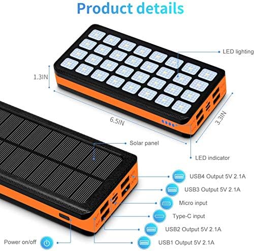 【4 Output Ports & 2 Input Ports】The portable charger power bank is equipped with 4 output ports and 2 input ports, including 1* Type C input port and 1* micro input port. The solar phone charger can support charging 4 devices at the same time. Compatible with most of smartphones, tablets, earphones, cameras and other devices in the market.