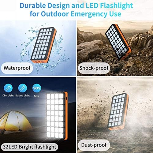 Solar Charger PS000 30000mAh Power Bank Camping Waterproof External Backup Charge with 4 Outputs & Dual Inputs 32 LED Light Flashlight Backup Battery(Orange)