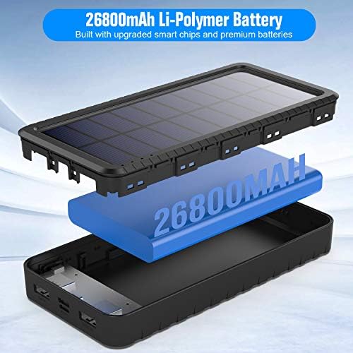 ????【26800mAh High Capacity & Universal Compatibility】The solar power bank built-in 26800mAh Li-polymer battery, it’s enough to charge an iPhone XS for 6.8 times, Samsung Galaxy S10 up to 5-6 times, an iPad Pro for 2 times; No worries with the low battery of your mobile phone. Power bank is compatible with all electronic devices which have USB port, such as iPhone, iPad, Android, tablet , camera and more;