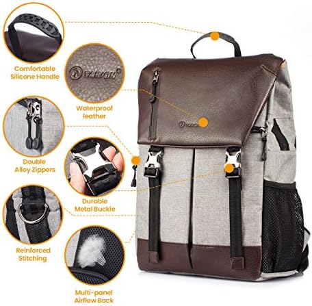 Waterproof IPX5: the camera backpack is made of PU leather and water-repellent polyester canvas material. The camera backpack (together with the rain cover) has been officially tested and rated IPX5 waterproof.