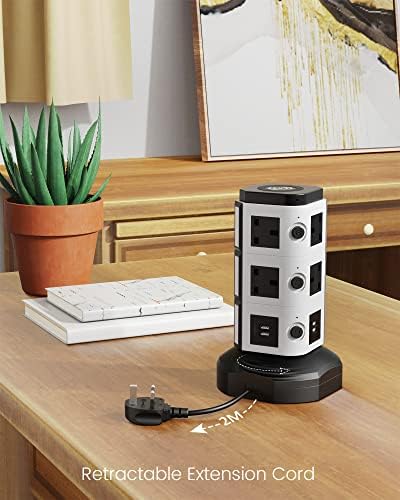 Tower Extension Lead [13A 3120W] with 10 AC 4 USB Slots, 10W Wireless Charging, Surge Protector, ONLYWIN Power Strip Tower with 2M Retractable Extension Cords for Home Office – White Black