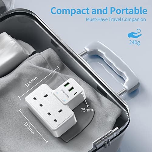 5 in1 Travel Adapter UK to USA — 2 AC outlets + 2 USB-A + 1 Type C slots allows you to power 5 electric appliances at the same time. Rated power up to 3250 Watt (max 250 Volt, 13 A). This Grounded US Travel Adapter accepts the standard UK plug. You could power up UK appliances and devices like Cameras, Hairdryers, Power bank, Phones, Laptops and Tablets, etc..